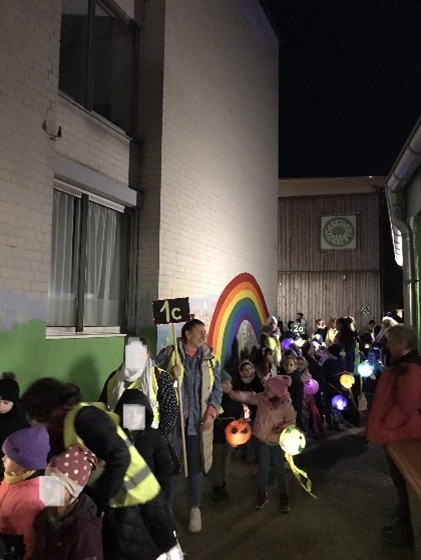 Entlang der Wegstrecke hatten sich zahlreiche Familien und Nachbarn versammelt und winkten unseren Laternenträgern zu. Viele Häuser und Vorgärten waren festlich beleuchtet – als wollten auch sie den Zug willkommen heißen.