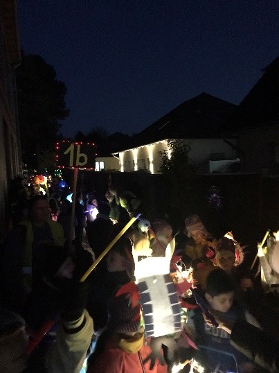 Pünktlich zum Einbruch der Dunkelheit versammelten sich die zehn Klassen unserer Grundschule auf dem Schulhof und zogen dann über die Mozartstraße und Schubertstraße zum Eiler Schützenplatz. Angeführt wurde der Zug – wie es sich gehört – von Sankt Martin auf seinem weißen Pferd. Im Zug spielte die Musikkapelle traditionelle Martinslieder, und schon nach den ersten Takten stimmten unsere Schülerinnen und Schüler mit ein.